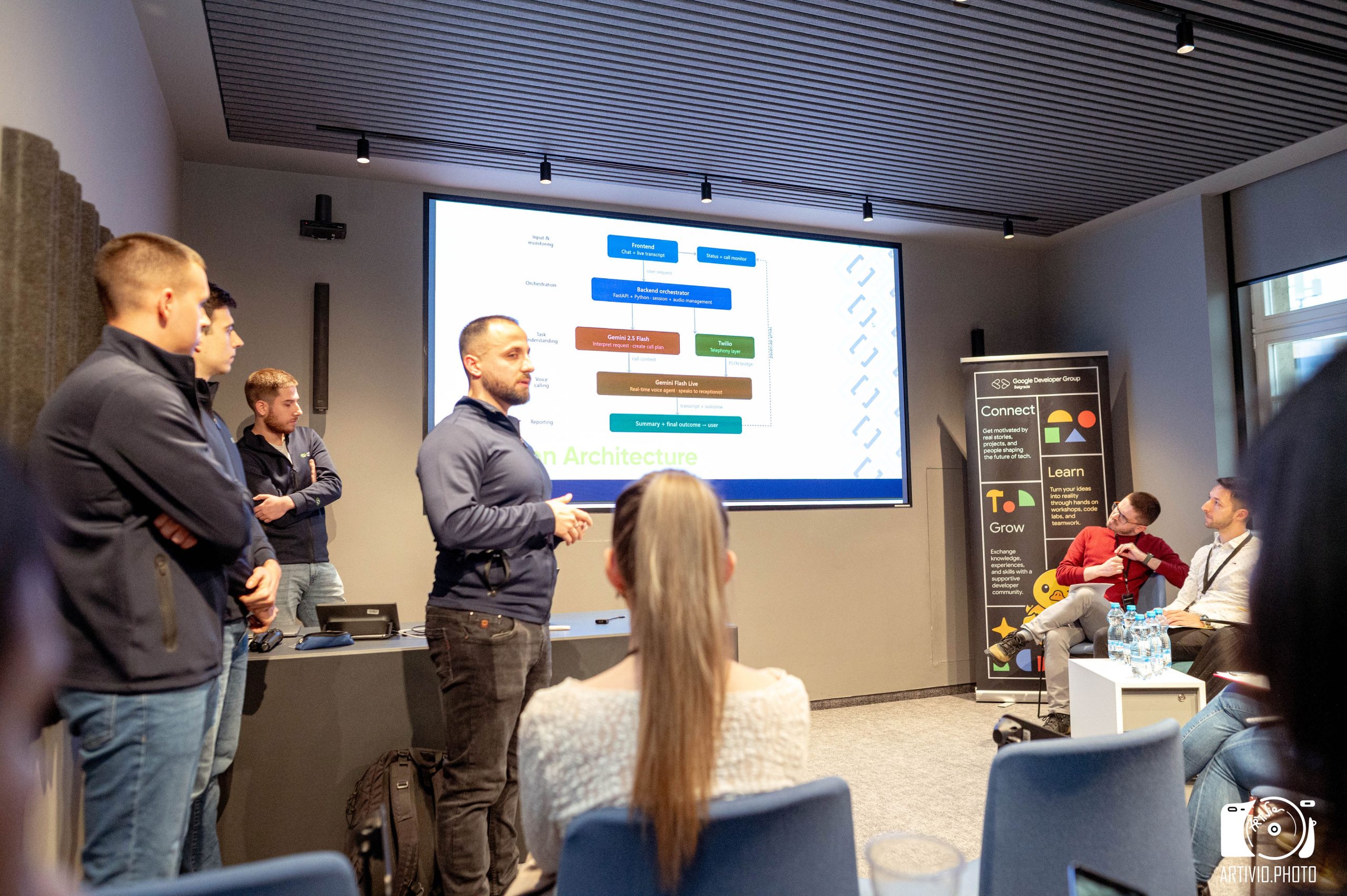 Победнички пројекат нашег тима носи назив DeafConnect. У питању је напредан систем базиран на AI агентима, дизајниран да значајно унапреди квалитет живота особама са оштећеним слухом и говором. Ова иновативна платформа корисницима омогућава потпуну самосталност у свакодневним активностима – од обављања телефонских позива и заказивања медицинских прегледа, до решавања уобичајених дневних обавеза, равноправно и без баријера.